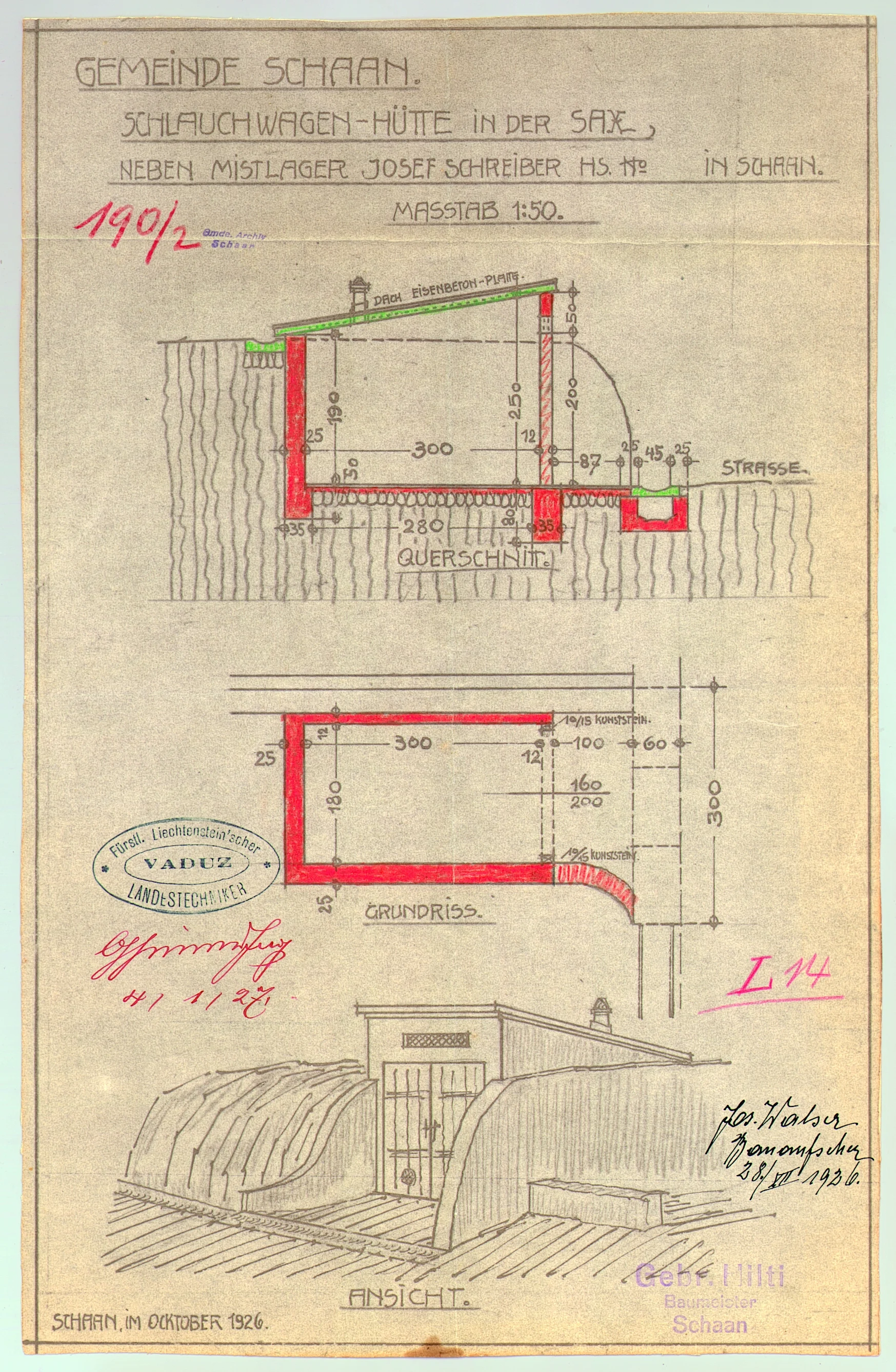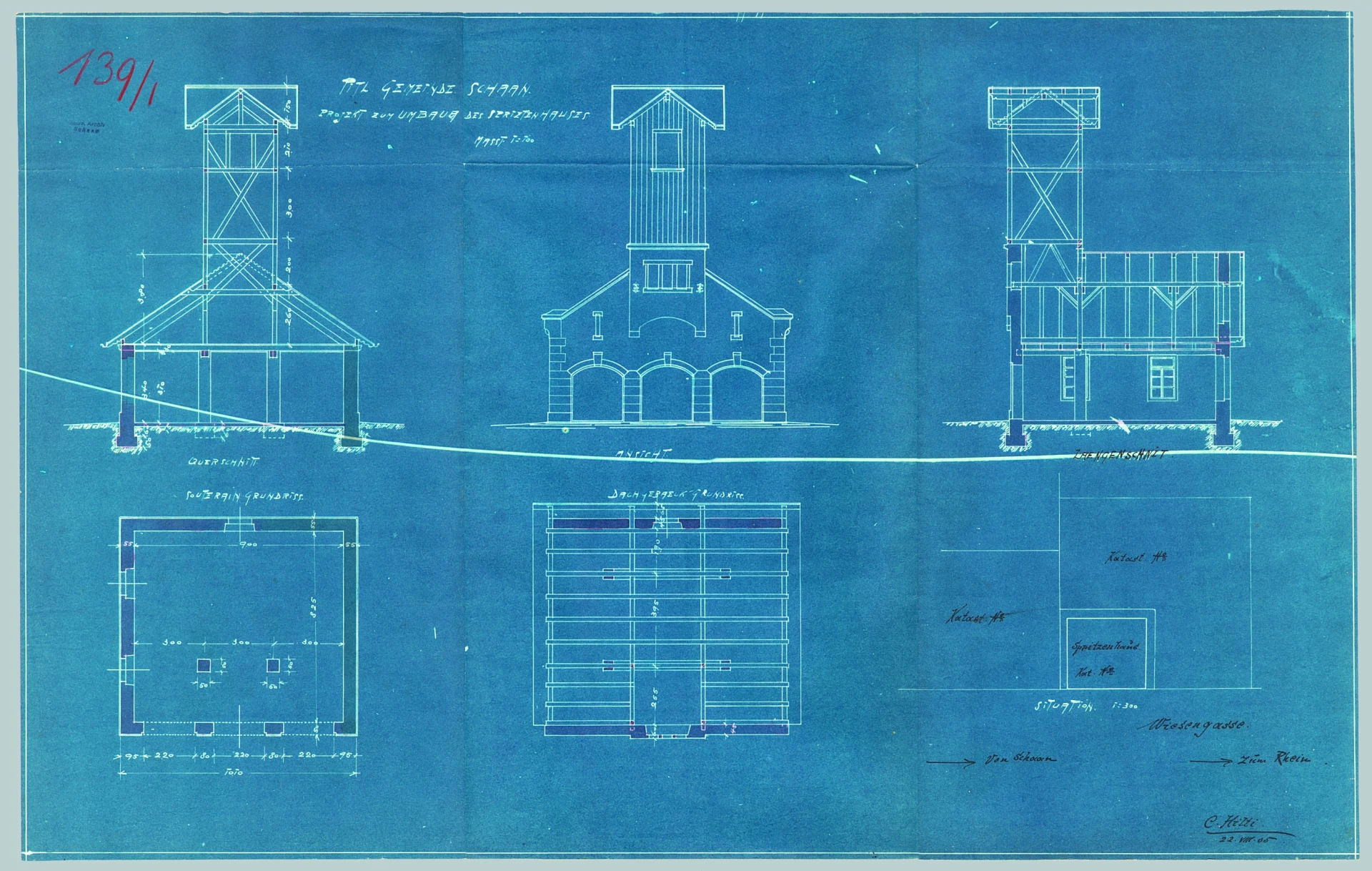Ein Projekt für den Umbau des Spritzenhauses 190569 von C. Hilti sah einen gemauerten Bau mit Schlauchturm vor. Das Projekt wurde jedoch nicht realisiert. Erst am 27. Februar 1925 erteilte das Bauamt eine Baubewilligung für einen «Trockenturm auf das bestehende Spritzenhaus».