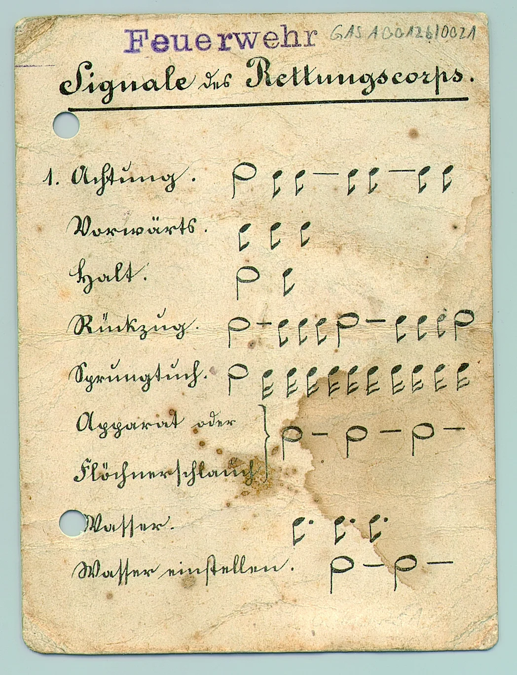 «Achtung», «Vorwärts», «Halt», «Rückzug», «Sprungtuch», «Apparat oder Flöchnerschlauch», «Wasser», «Wasser einstellen» (GAS A 12b/21)